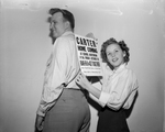 Eager for the Amon Carter Riverside High School homecoming to be the best ever, Exes President M. B. Easter has an announcement poster strung on his back by Mrs. Pat Thompson, activities chairman. A business meeting and pep rally will be held and a barbecue at the school after the North Side-Carter football game. Published in Fort Worth Star-Telegram evening edition, October 17, 1950. A man and a woman standing together smiling. A sign is behind them.
