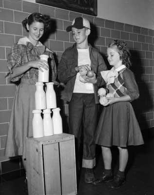 Getting ready for the Meadowbrook School carnival are left to right, Mary White of 5025 Norma, Bill Briggs of 3855 Medford Road, and Susan McCarty of 4501 Morris Connecticut. Published in Fort Worth Star-Telegram evening edition, October 17, 1950. A boy and two girls playing around stacked up bottles.
