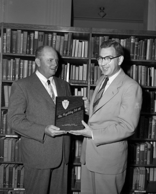 With the 25th annual national convention of the 36th Division Association. Colonel Andrew F. Price, chairman of the distinguished guests committee, presented Librarian Ibbottson a heavily bound history of the two-war Texas combat outfit for Fort Worth citizens and convention visitors to look at in the Public Library. It is a permanent gift to the library. Published in Fort Worth Star-Telegram evening edition, October 17, 1950.