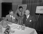 Civil Aeronautics Administrator Donald W. Nyrop, Robert Cook, secretary of the Airports Advisory Committee of the Civil Aeronautics Administration, and A. B. Curry of Miami, committee chairman, are shown, left to right, at committee's meeting. Three men wearing suits standing and sitting down discussing at a table. Published in Fort Worth Star-Telegram evening edition, October 16, 1950.