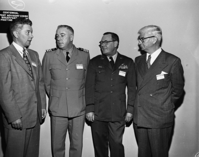 Discussing aspects of civil aviation's part in the preparedness program at the airport meeting here are left to right, CAA Administrator Donald W. Nyrop, Commander E. J. Lanigan, office of the Chief of Naval Operations; Colonel Harry W. Gowins, office of the special assistant to the Chief of Staff for Reserve Forces, and A. B. Curry of Miami, chairman of the Airports Advisory Committee of the CAA. Four men wearing suits and a military officer uniform. Published in Fort Worth Star-Telegram morning edition, October 17, 1950.