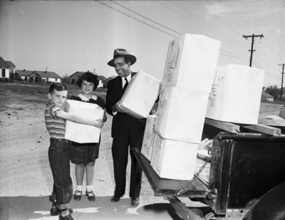 Michael McKeever, son of Mr. and Mrs. Hugh B. McKeever of 7428 Gaston, and Jo Ann Fedor, daughter of Mr. and Mrs. Joseph W. Fedor of 5912 Malvey, third graders at Saint Alice's School, help Eugene Sergi load their classroom's clothing gifts onto a truck, first step on the way to children in Italy. Published in Fort Worth Star-Telegram evening edition, October 18, 1950.