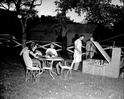 The parrot, Lorita, is a member of the Crestwood neighborhood and watches barbecue preparation with glee. Left to right are Mrs. Irving H. Webb at whose home, 416 Eastwood, the barbecue pit is a gathering place; Mrs. Scout Smith, "Chef" Webb and Scout Smith. Two woman sitting in outside chairs and tables. Two men are by the barbecue grill, one is wearing a suit and one is wearing white clothes holding a spatula on the grill. Published in Fort Worth Star-Telegram morning edition, October 22, 1950.
