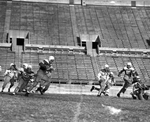 Dick Thompson of Sterling is shown as he breaks loose on 76-yard touchdown run in junior high game with Carter Riverside. That's Charles Boles (30) barely missing the tackle. Published in Fort Worth Star-Telegram evening edition October 18, 1950.