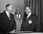 Owen W. Sherrill of Georgetown, president of the Texas Real Estate Association, center, paid an official visit to Fort Worth realtors. He is shown with Raymond Estes, left, vice president of TREA, and Durward McDonald Jr., president of the Fort Worth Real Estate Board. Published in Fort Worth Star-Telegram morning edition, October 18, 1950. Three men wearing suits standing together.