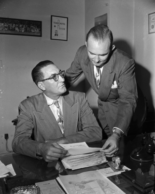 Twenty-five candidates were initiated into Fort Worth Elks Lodge Number 124 in ceremonies at the lodge. Exalted Ruler C. C. Barnhat was in charge of the initiation. The man sitting up is H. S. Lemmons. Two men sitting and standing looking over paperwork on a desk wearing suits. Published in Fort Worth Star-Telegram morning edition, October 18, 1950.