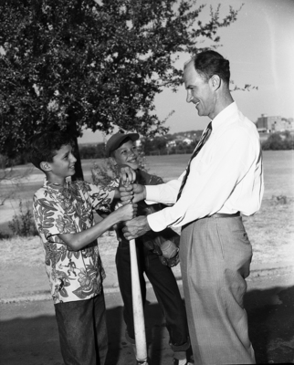Getting ready for the baseball game that the boys at Lily B. Clayton School will play with their fathers are left to right, Bruce Wallace, George Siddons of 1920 Berkley Place, and John Wallace of 2201 Park Place, Bruce's dad. The game is part of a "birthday party" planned for the school, founded 29 years ago. Published in Fort Worth Star-Telegram evening edition, October 19, 1950.