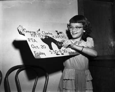 Joan Watkins, daughter of W. B. Watkins of 3208 Travis, proudly shows a placard bearing the name, "Kittens Capers", her winning name for the annual George Clark School carnival. The "Kittens" will caper at the school. Published in Fort Worth Star-Telegram evening edition, October 21, 1950.