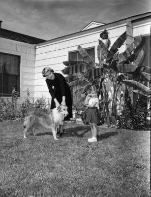 Mrs. Robert Violette, 3821 Crestwood Territory, pets "Cissy", the collie, as her neighbor, Jan Perry , daughter of Mr. and Mrs. Eugene H. Perry, 3817 Crestwood Territory, looks on. The Violette's are proud of their banana tree. A woman, a little girl, and a dog standing up. The woman is petting the dog. Published in Fort Worth Star-Telegram morning edition, October 22, 1950.