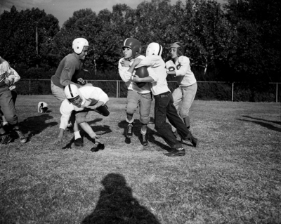 To uniform the spirited "Little Micks", football team of Saint Mary's School, the Mother's Club will conduct a parish bazar. Shown here are left to right, Joe Colleran, Robert Campbell, James Jay, Joe McGarrey and Jack Harkrider. Published in Fort Worth Star-Telegram evening edition, October 25, 1950.