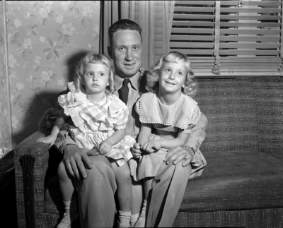 Anna Ruth, 3, left, and Carroll Loraine, 6, right, had their daddy home their mother's illness brought Sergeant J. D. Kimberlin all the way from the 38th parallel in Korea. Kimberlin is believed to be the first soldier to return to Fort Worth from the combat area uninjured. Published in Fort Worth Star-Telegram evening edition, October 19, 1950.