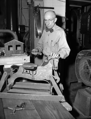 C. E. Stripling finds time from his varied duties as building maintenance engineer at First Methodist Church to repair toys for the nursery and kindergarten departments of the church school. Published in Fort Worth Star-Telegram evening edition, October 21, 1950.