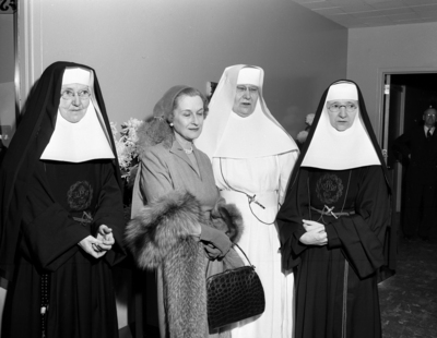 Mrs. Burton Carter, second from left, smiles with three nuns.