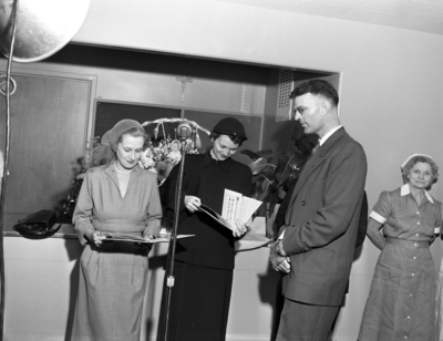 Mrs. Ruth Carter Johnson, center, with her mother Mrs. Nenetta Burton Carter, left, and unidentified man standing together behind a microphone at dedication of new obstetrics wing at Saint Joseph's Hospital on Ruth Carter Johnson's birthday.