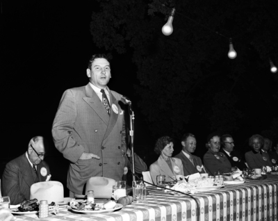A man stands and speaks into a microphone at an Airport Advisory Party hosted at Shady Oak Farm. Amon G. Carter can be seen seated behind him on the left.