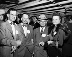 A woman in fur stands with three men at an Airport Advisory Party hosted at Shady Oak Farm.