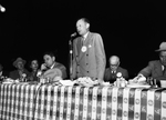 A man stands and speaks into a microphone at an Airport Advisory Party hosted at Shady Oak Farm. Amon Carter can be seen seated behind him.