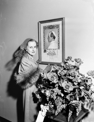 Mrs. Burton Carter pictured with the parchme papel blessing sent for the dedication of the OB Wing at Saint Joseph's Hospital.