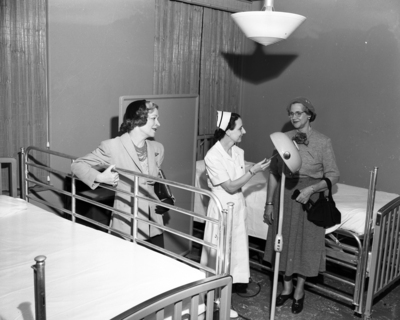 Loma Hoagland, left, watches as Miss C. Burch demonstrates for Mrs. Sam Palmer, right, the new equipment in one of the lying-in rooms.