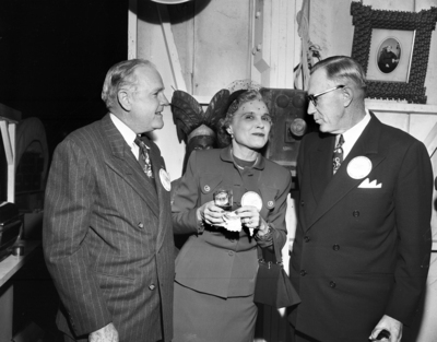 A woman with a drink in her hand stands between two men. This picture was taken at an Airport Advisory Party hosted by Shady Oak Farm.
