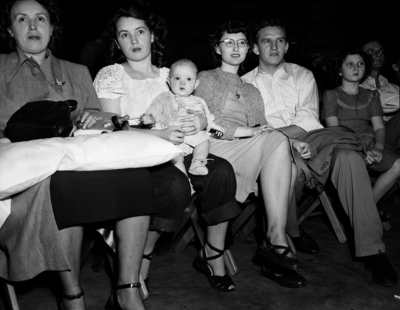 Mrs. Earl Rice's 6-month-old daughter, Linda Jo, may be the youngest Gloves fan this year. Mrs. Rice holds Linda Jo on her lap. Published in the Fort Worth Star-Telegram morning edition, January 23, 1950.