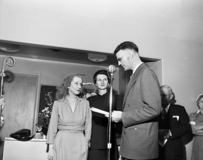Mrs. Ruth Carter Johnson III, right, and Mrs. Nenetta Burton Carter, left, stand together behind a microphone while a man speaks into it.