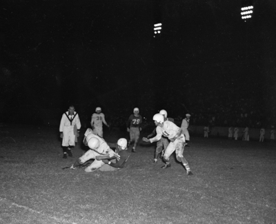 Bob Wilson, Paschal end, tumbles to the ground past the goal line for the Panthers' fourth touchdown against Tech at Farrington Field. Making the tackle is Bill Pennington, Bulldog back. Touch down play was a pass. Robert Towery to Wilson. Published in Fort Worth Star-Telegram morning edition October 20, 1950.