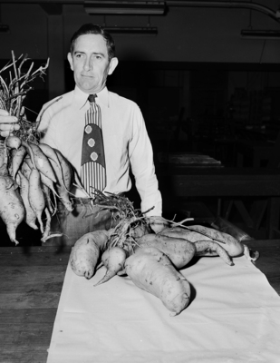 Posed image shot of W. S. Blakeslee and his sweet potatoes, that he raised in his garden. Blakeslee started his sweet potato garden after moving to a new home close to the United States Army Air Field and has even gone as far as taking music lessons to play on a sweet potato. Published in Fort Worth Star-Telegram 1950.