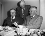 Setting down to a luncheon given in their honor by the Fort Worth National Bank after a Greyhound Corporation directors' meeting. Left to right, C. E. Wickman of Chicago, chairman of the corporation's board; P. W. Tibbetts of Fort Worth, president of Southwestern Greyhound, and Orville Ceasar of Chicago, corporation president. Published in Fort Worth Star-Telegram morning edition, October 20, 1950.