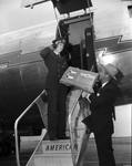 Fred Korth, right city chairman of the Crusade for Freedom drive, personally delivered this batch of Fort Worth Freedom Scrolls to Captain C. B. Roe, pilot of American Arline's' flagship "Abilene", which flew the scrolls to New York. Published in Fort Worth Star-Telegram morning edition, October 20, 1950.