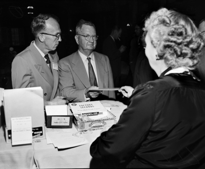 Mrs. Clara Bussell of the Abilene staff of the West Texas Chamber of Commerce, registers Ralph Duncan, manager of the Haskell Chamber of Commerce and secretary of the Bob Baskin Dam Association, and Delegate R. G. Armor of Eden. Published in Fort Worth Star-Telegram morning edition, October 20, 1950.