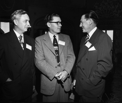 J. R. Wright, left, of Vernon, program chairman for the WTCC next year, confers with E. O. Wedgeworth, center, of Pampa, president of the West Texas Managers Association, and Clyde C. Westfall of Stamford, program committee chairman for this year's meeting. Published in Fort Worth Star-Telegram morning October 20, 1950.