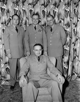 Here to help North Texas manufacturers plan industrial mobilization for national defense were standing, left to right, Major M. T. Gresham, Lieutenant Colonel L. M. Flint and Major J. C. Motter. Seated is their "boss", Colonel Jaromir J. Pospisil chief of the Quartermaster Corps Atlanta mobilization district. Published in Fort Worth Star-Telegram evening October 19, 1950.