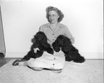 Mrs. Ervin Johnston, 2409 Wilson Road, with two of her black cockers, Prince Ebony and Gay Lady Priscilla. They are a mother and son combination and look so much alike they will be entered as a brace in the Lone Star Cocker Club's show November 4 at the Recreation Building. They will also be in the dam and get class and their regular classes. A woman with two black dogs sitting on the floor. Published in Fort Worth Star-Telegram morning edition, October 22, 1950.