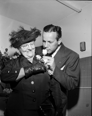 C. J. Lauden of Tyler, president of the Texas Rose Festival, admires a rose worn by Mrs. Mary Daggett Lake at the second annual Rose Show at Leonard's Department Store. The show attracted about 25,000 visited. A man with his arm around a woman sniffing a flower on her dress. Published in Fort Worth Star-Telegram morning edition, October 21, 1950.