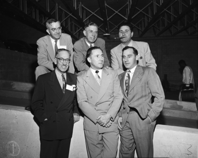 All present or past officers and directors of the Eastland Chamber of Commerce, are these men attending the WTCC convention. From left, front row: H. J. Tanner, chamber manager; Homer Smith and John Kilgore, directors. Back row: W. B. Pickens, past vice president; John Osborne, current president, and Hood King, past president. With two other men not shown in the picture, Grady Pipkin, past vice president, and Fred Brown, past president, the Eastland delegation constituted the largest at the convention. Published in Fort Worth Star-Telegram morning edition, October 21, 1950. Six men wearing suits sitting and standing together.
