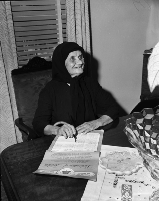 Mrs. Mary Fenichis, 100,000th Signer. A woman sitting at a desk holding a pen on a document paper. She is looking up wearing a black dress and head scarf. Published in Fort Worth Star-Telegram morning edition, October 21, 1950.
