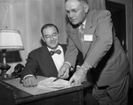 Fred H. Husbands of Waco, left, elected as the new West Texas Chamber of Commerce executive vice president and general manager, looks over map of West Texas with B. P. Bludworth of Brownwood, slated as new WTCC president. Published in Fort Worth Star-Telegram evening edition, October 20, 1950. A two men sitting and standing by a desk looking over paperwork.