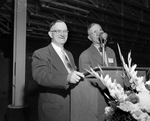 Hubert M. Harrison, left, general manager of the East Texas Chamber of Commerce, is introduced by J. M. Wilson of Floydada, outgoing West Texas Chamber of Commerce president, at banquet for local managers. Two men wearing suits, one man has a microphone in front of him. Published in Fort Worth Star-Telegram evening edition, October 20, 1950.