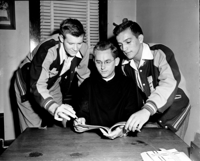 Discussing a magazine sales campaign designed to help Laneri High School pay costs of a school annual and automatic basketball scoring equipment for a new gymnasium are left to right, Eugene Freeman, general chairman, Reveron Herbert Vogelpohl, OSB, and Pris Duran, publicity. The school previously has acquired a movie projector, football uniforms and basketball jackets in this way. Published in Fort Worth Star-Telegram morning edition, October 22, 1950. Three teenage boys looking at a magazine together. Two boys standing up looking down and one sitting in the center looking down.