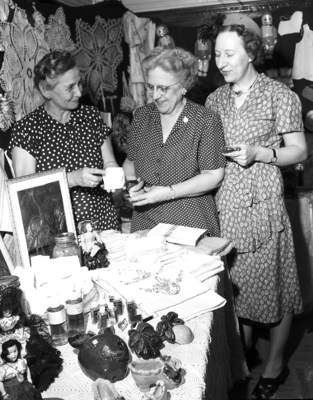 Mrs. Joe Porow, right, and Mrs. G. C. Schurman, center, give their approval to merchandise in the 36th Division Association Auxiliary bazar, shown them by Mrs. Bernice B. Maxfield, auxiliary president. Proceeds are for gifts to hospitalized veterans of the division. The bazar will be held all at 1007 Marion. Published in Fort Worth Star-Telegram morning edition, October 24, 1950. Three woman wearing dresses standing together.