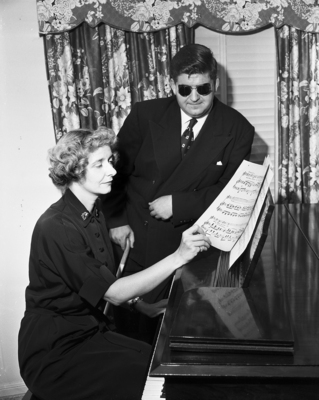 Mrs. F. M. Lege III and Howard Griffin, rehearsing for a radio program which will be an "advance" program for the four-concert series to be sponsored by the Fort Worth Junior League. The opening concert November 3 will be by Jorge Bolet, Cuban pianist. Published in Fort Worth Star-Telegram morning edition, October 25, 1950.