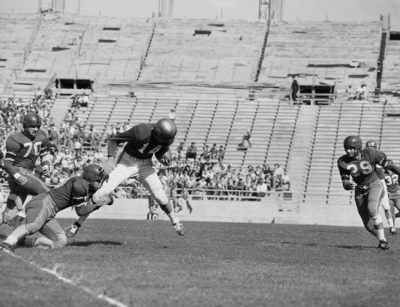 Texas Tech's Eural Ramsey clamps a tackle on Larry Isbell's knee to bring the Baylor back to earth after he gained 13 yards in the game at Waco. Number 70 is Texas Tech's Jack Cockburn. Published in Fort Worth Star-Telegram morning edition October 22, 1950.