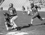 Bob Trout, junior Baylor letterman from Bowie, lights with the ball after catching a pass against Texas Tech. Making the tackle is Jim Turner. Published in Fort Worth Star-Telegram morning edition October 23, 1950.