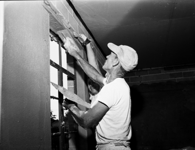 John C. Stoughton, left, and Fred Cope Jr., were among the union plasterers who donated their labor to plaster the interior of the Goodwill House at 915 Broadus. Published in Fort Worth Star-Telegram morning edition, October 22, 1950. A man wearing white shirt and hat painting a house window.