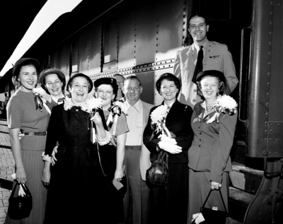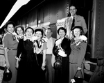 Some Texas Christian University Supporters paused just before swarming onto the last car of their A&M-bound special train to yell for the Frogs. Left to right are Mrs. Paul Groves, Mrs. Bill Burnett, Mrs. M. R. Carb, Mrs. O. A. Seward, Carb, Bill Shurtleff, Mrs. L. T. Meacham, Mrs. Shurtleff and Captain Groves. Published in Fort Worth Star-Telegram evening edition, October 12, 1950.