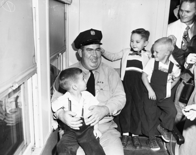 Three small fry are entertained by Barney Lowrey, school employee and member of the fire department, as Arlington football fans ride a special train to Terrell. Left to right are Mike Dunlap, Dick Fitzgerald and Roland Lee Kunkel. Published in Fort Worth Star-Telegram morning edition, October 22, 1950.