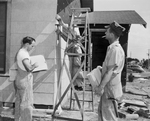 Two of the 16 co-workers who spent day off from the Quartermaster Depot helping Clarence G. King, right, finish his house in time to leave for Seabee duty were Cecil King, left, and Steve Coppedge. One man is on a ladder and two men standing below looking at a book and looking at the man. Published in Fort Worth Star-Telegram evening edition, October 23, 1950.
