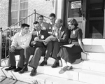 Fundamentals of state government were being propounded for Hi-Y groups of Northeast Texas at Texas Christian University. Conference leaders included Professor Comer Clay, left, of the Texas Christian University faculty, and Ed A. James, Tyler. Looking on are Orrie Harris, Corsicana, and Robert Young, Polytechnic Hi-Y, Fort Worth. Published in Fort Worth Star-Telegram evening edition, October 21, 1950.