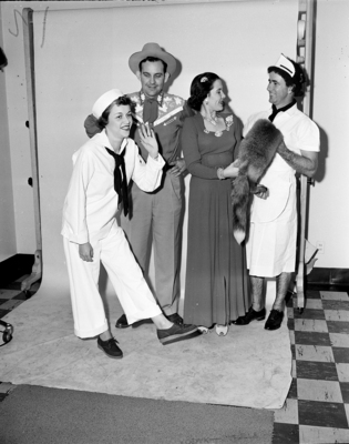 Mrs. Grover Cole Jr., wishes she might have been a Mary Martin-ish Nelly Forbush; Mr. Cole, second from left, would have been a square dance caller; and Roy J. Brooks, right, dressed as a maid to gratify the suppressed desire of Mrs. Brooks, second from right, who would have been a bejeweled lady. They were in costume for the recent suppressed desires party given by the Young Men's Club. Published in Fort Worth Star-Telegram evening edition, October 26, 1950.